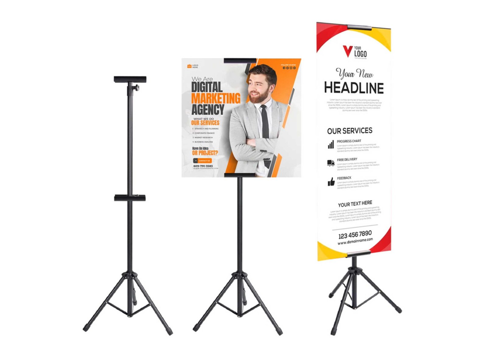 Tripod banner adalah media promosi praktis berbentuk poster yang berdiri di atas kaki tiga (tripod), sering dipakai untuk menampilkan informasi produk, diskon, atau logo bisnis di berbagai acara (pameran, toko, seminar).